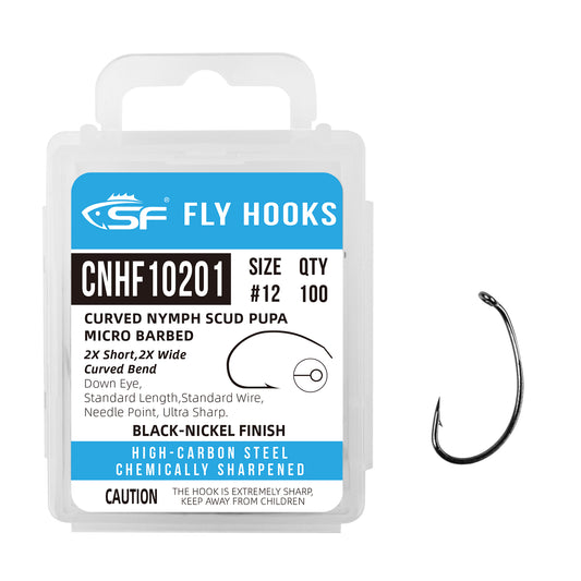 SF Curved Nymph Scud Pupa Fly Tying Hooks Micro Barbed Black Nickel High Carbon Steel Fly Hook with Mini Box #10#12#14#16 100Pcs