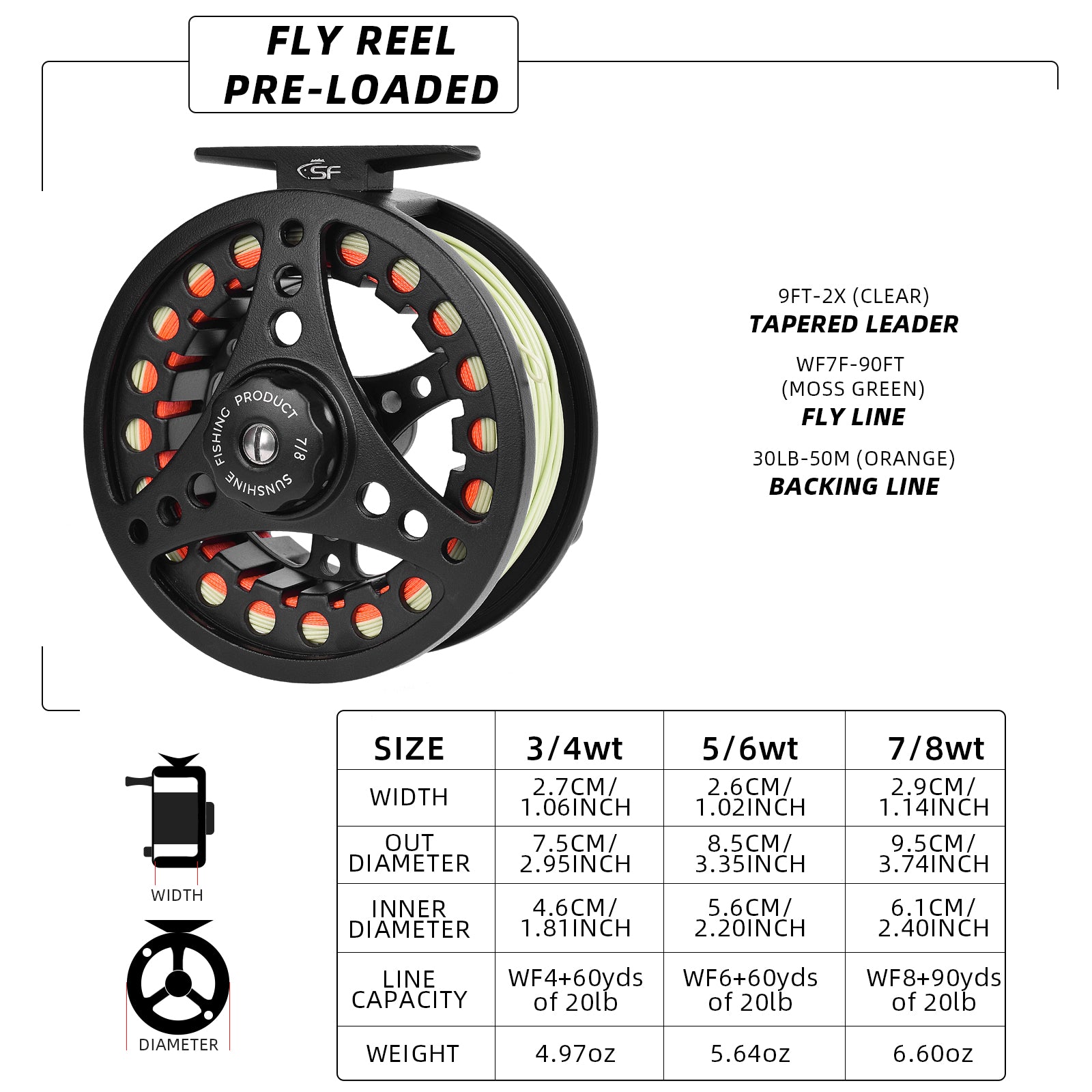Pre-loaded fly reel: Matt black 7/8wt, the die-cast aluminum-alloy reel adopts surface anti-corrosion treatment. And the large arbor design is helpful to quick line retrieval. It is pre-loaded with WF7F-90FT fly line(Moss Green), 30LB-50M backing line(Orange), and 9FT-2X tapered leader nylon(Clear). It is very suitable for fishing lovers and beginners.